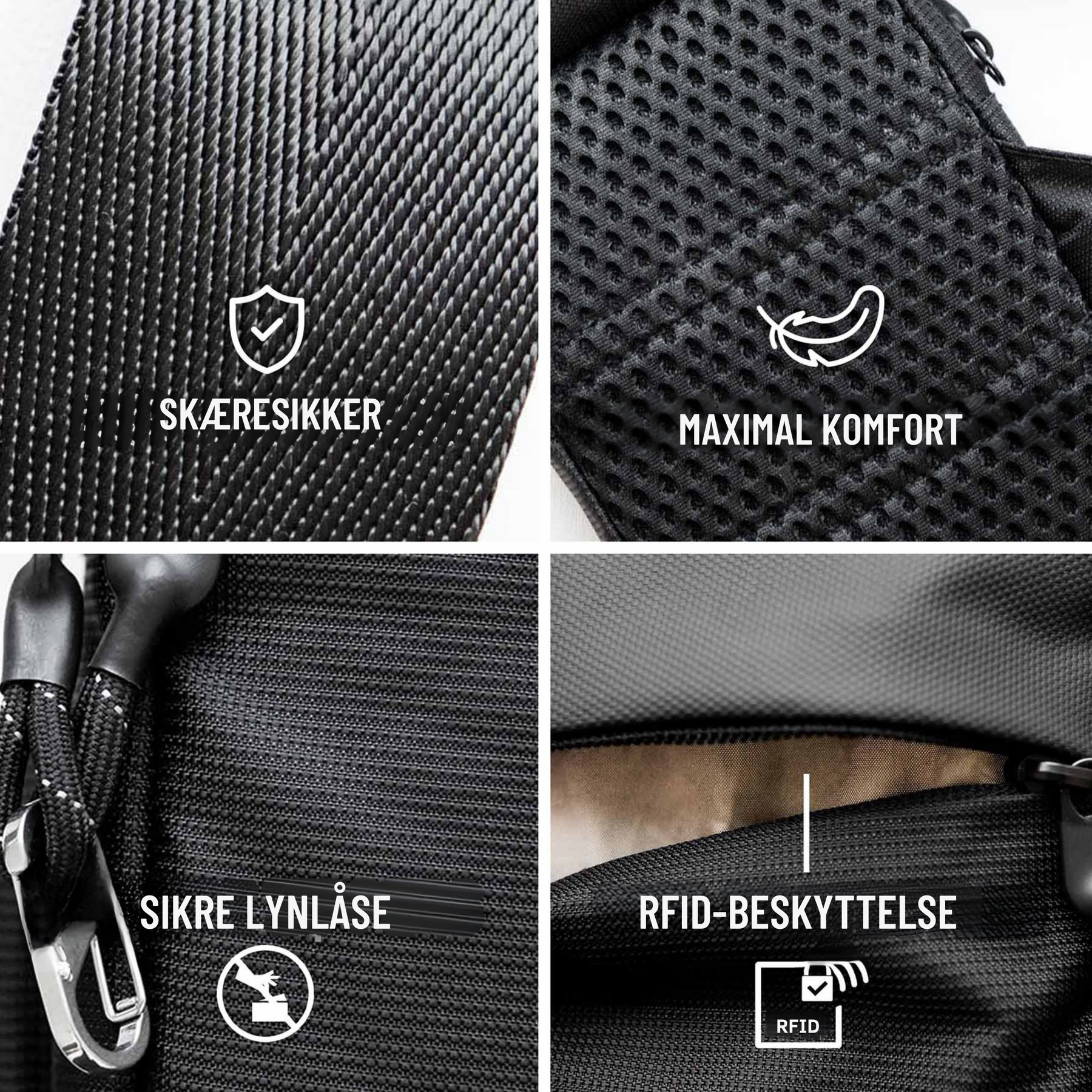 Jeg elsker, hvor stilren og moderne designet er – det passer til alle mine outfits og ser ikke ud som en traditionel sikkerhedstaske. Super flot og diskret!