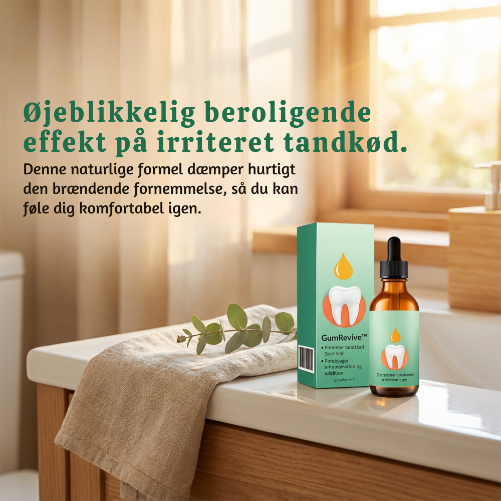 Hurtig beroligende lindring – Disse dråber hjælper med hurtigt at dæmpe irritation i tandkødet, så den brændende, dunkende fornemmelse aftager hurtigere. Brug GumRevive™ dagligt for igen at kunne børste og spise komfortabelt.