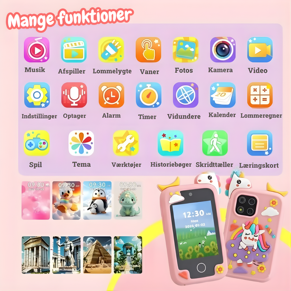 Gør nysgerrige små hænder til ivrige små lærere med MiniCall™ – den børnesikre “smartphone”, der lærer tal, farver, dyr og musik, mens dit barn forbliver helt skærmfrit.