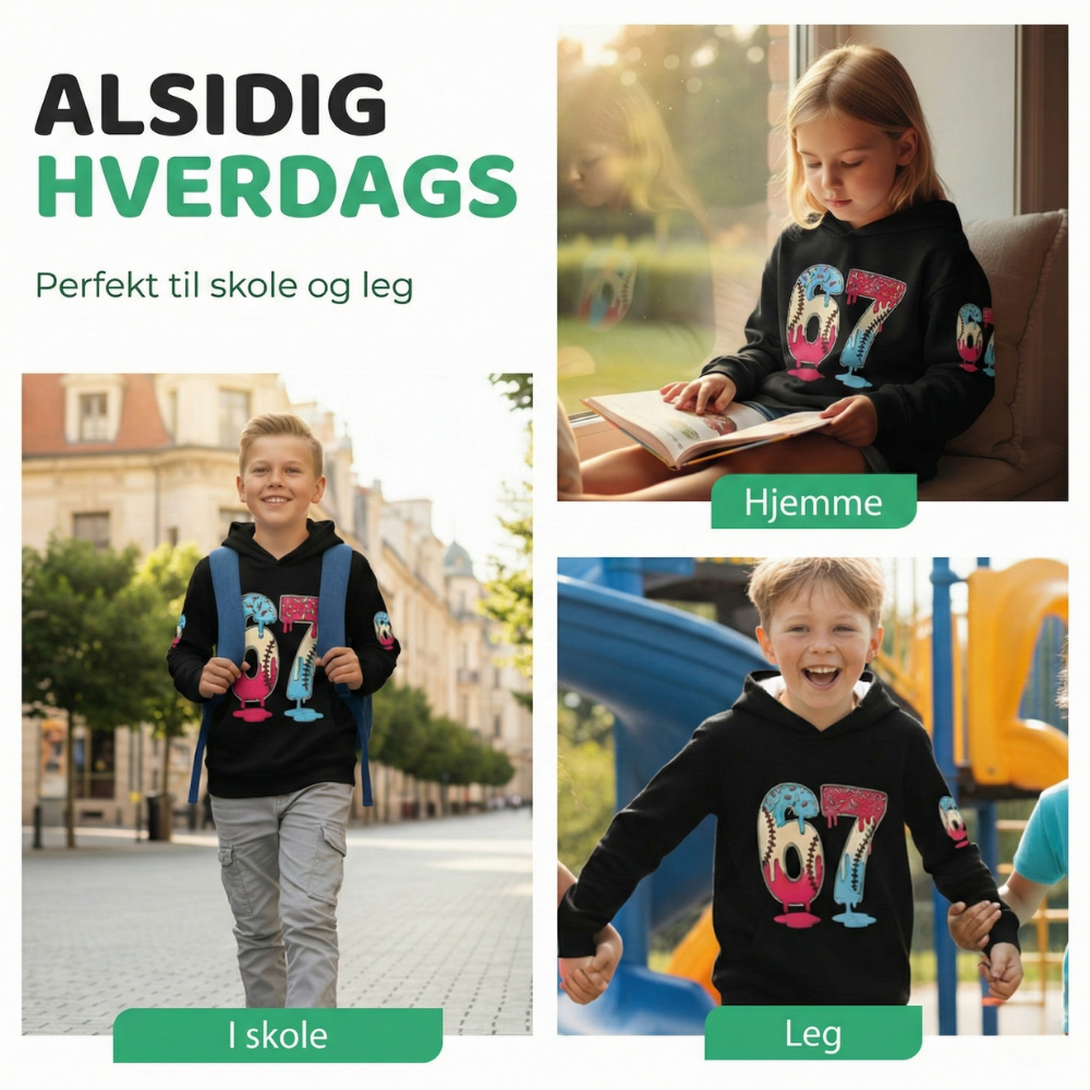 Livligt digitalt print – Med et legende “67”-design med donut- og baseball-detaljer tilføjer printet øjeblikkelig personlighed til ethvert outfit. Dit barn får den ekstra “cool faktor” i skolen, til legeaftaler og på familieture.