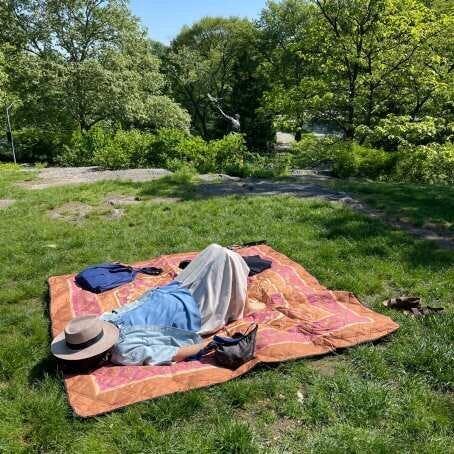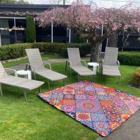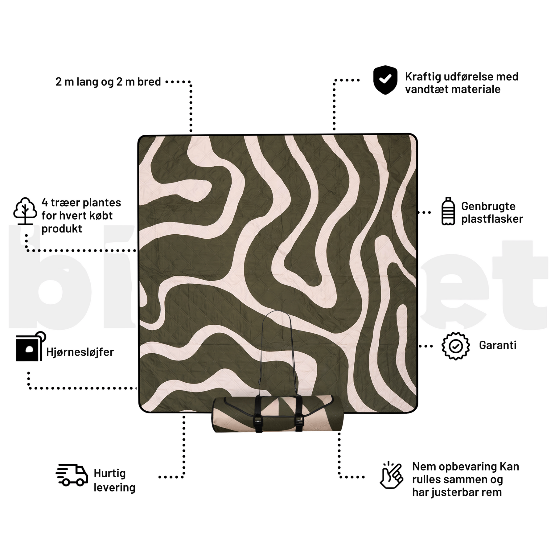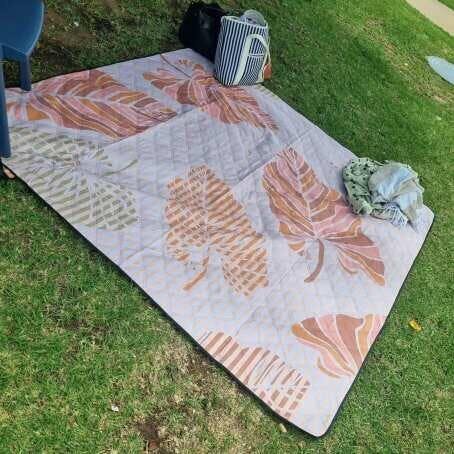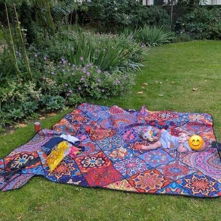 EcoLoom™ holder mig tør selv på fugtigt græs. Vi har haft picnic efter en regnvejrsdag, og det var ingen problem. Undersiden er virkelig robust og vandafvisende. Det er rart at vide, at vi kan nyde naturen uden bekymring for våde tæpper.