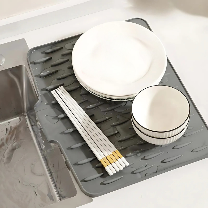 AquaGrid™ holder min køkkenbordplade helt tør. Afløbsrillerne leder vandet væk hurtigt, så opvasken tørrer effektivt, og der er ingen vandpytter tilbage.