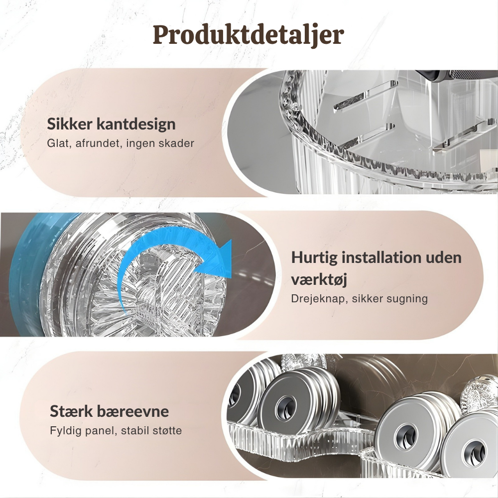 Mød FlexiDrain™—den krystalklare vandhanehylde, der mangedobler din opbevaringsplads uden boring eller rod. Med sine førsteklasses, forstærkede paneler og vakuum-lås-sugning giver den urokkelig stabilitet på de fleste vaske—fra badeværelse til køkken. Elsket af tusindvis af organiserede hjem hjælper FlexiDrain™ dig med at holde flasker tørre, redskaber inden for rækkevidde og bordplader skinnende rene—hver eneste dag.