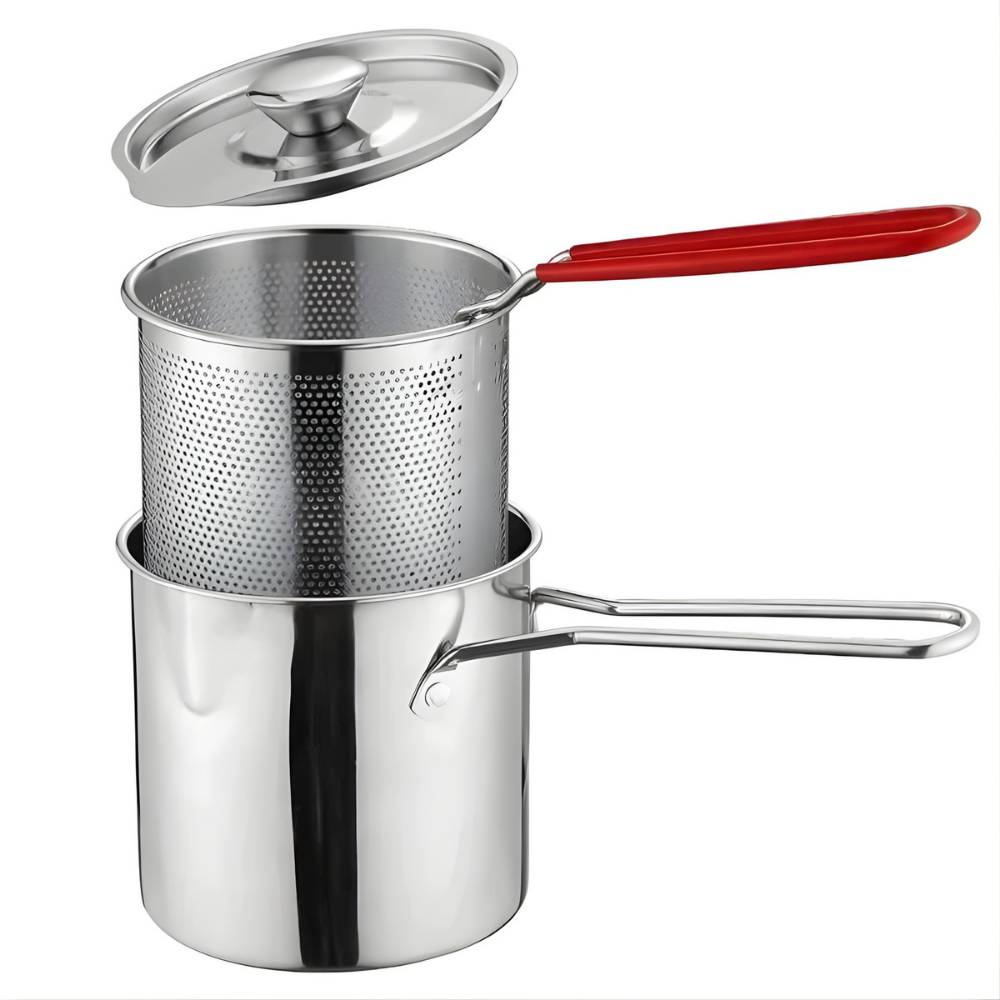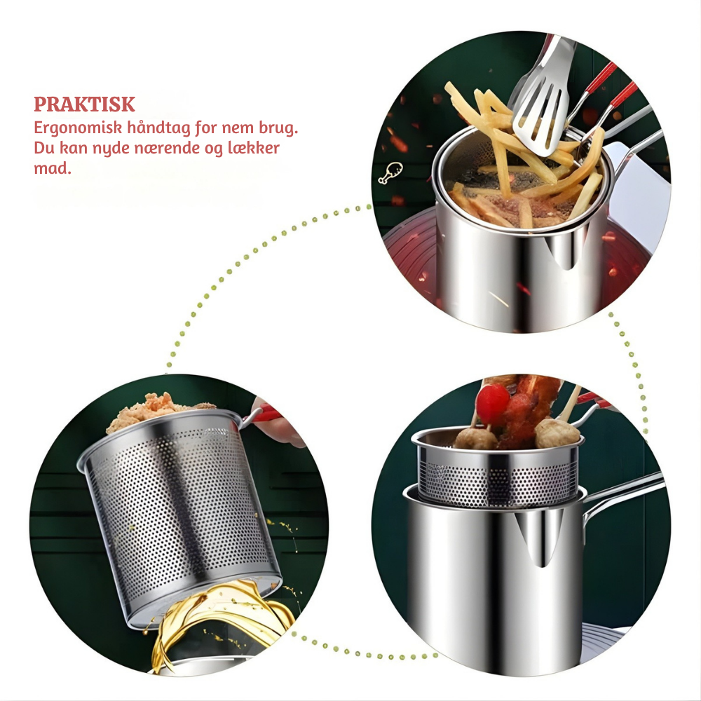 Den varmer hurtigt op og steger jævnt! Rustfrit stål føles meget solidt, og det dybe design sparer virkelig olie. Mine pommes frites blev gyldne og sprøde.