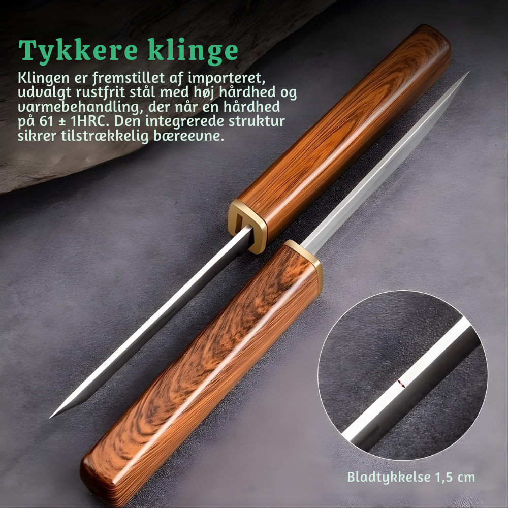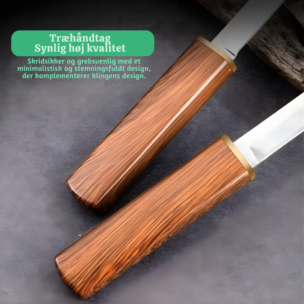Beskyttende opbevaring i træskede – Begge knive opbevares i en slidstærk træskede, som reducerer risikoen i tasken og beskytter klingerne mod elementerne. Det er sikrere at bære, hurtigere at få adgang til og nemmere at pakke til rejse.