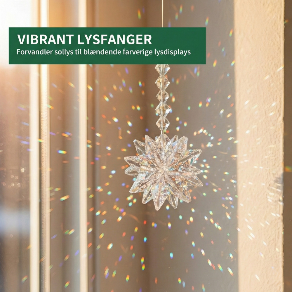 Sollys-til-regnbue-effekt – Når krystallen placeres i direkte sollys, forvandler den lyset til levende regnbuerefleksioner, der danser rundt i rummet. Det skaber en rolig, romantisk stemning, som straks løfter atmosfæren.