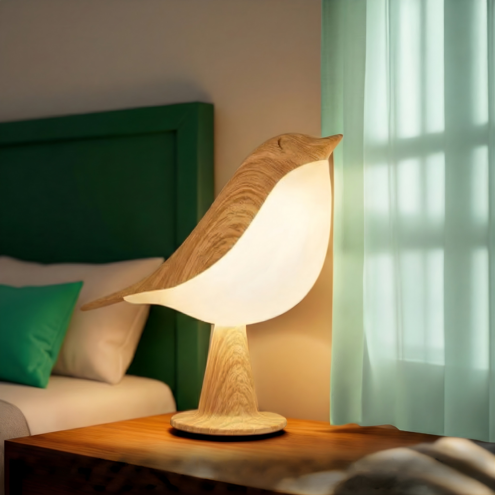 Naturinspireret æstetik – Fuglesilhuetten og trælook-basen tilføjer et fredeligt, organisk udtryk, der passer til moderne, minimalistisk eller hyggelig indretning. Den ligner dekoration om dagen—og bliver et beroligende natlys efter mørkets frembrud.
