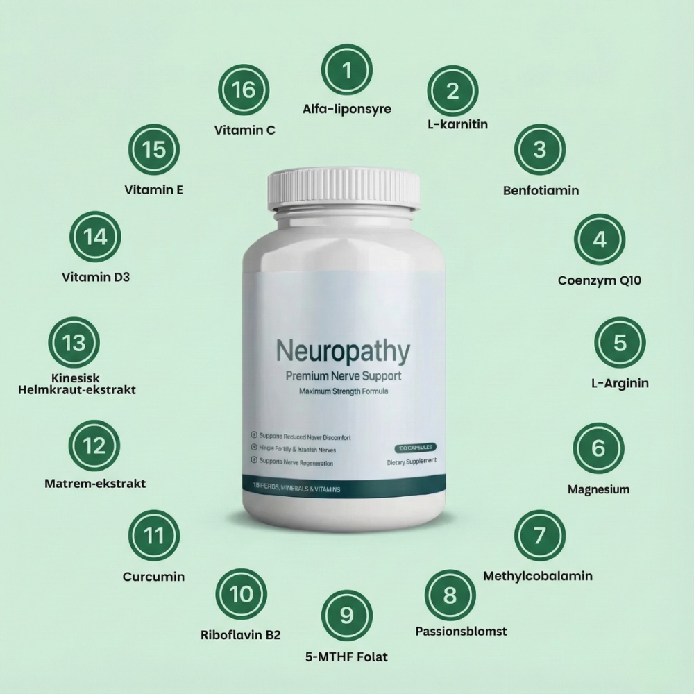Understøtter naturlig nerveregenerering – Retter sig mod årsagen ved at nære beskadigede nerver i stedet for blot at maskere ubehaget. Det kan fremme langsigtet reparation og sundere nervefunktion over tid.