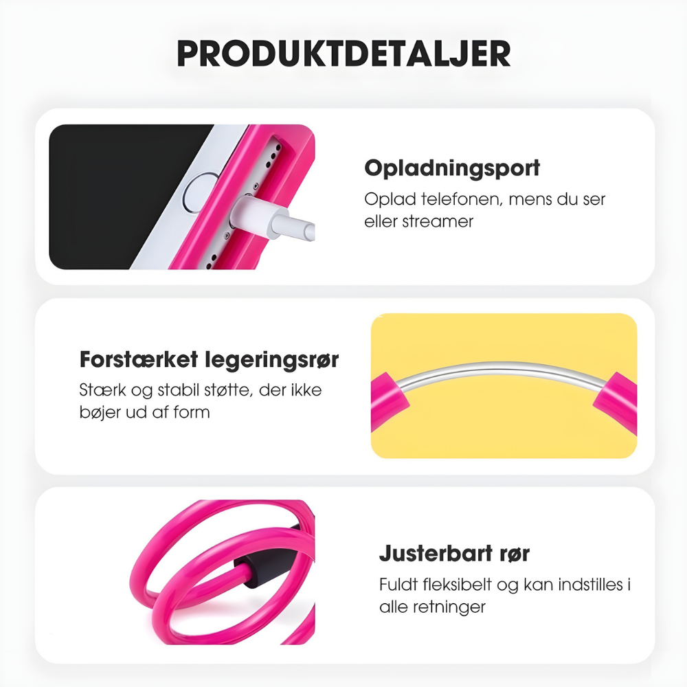 FlexiHold™ gør multitasking så nemt! Jeg kan lave mad og se mine yndlingsserier håndfrit uden nakkesmerter eller at tabe min telefon længere.