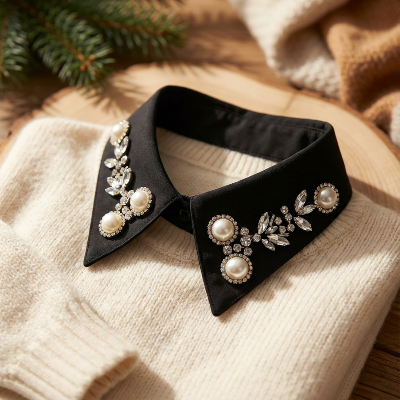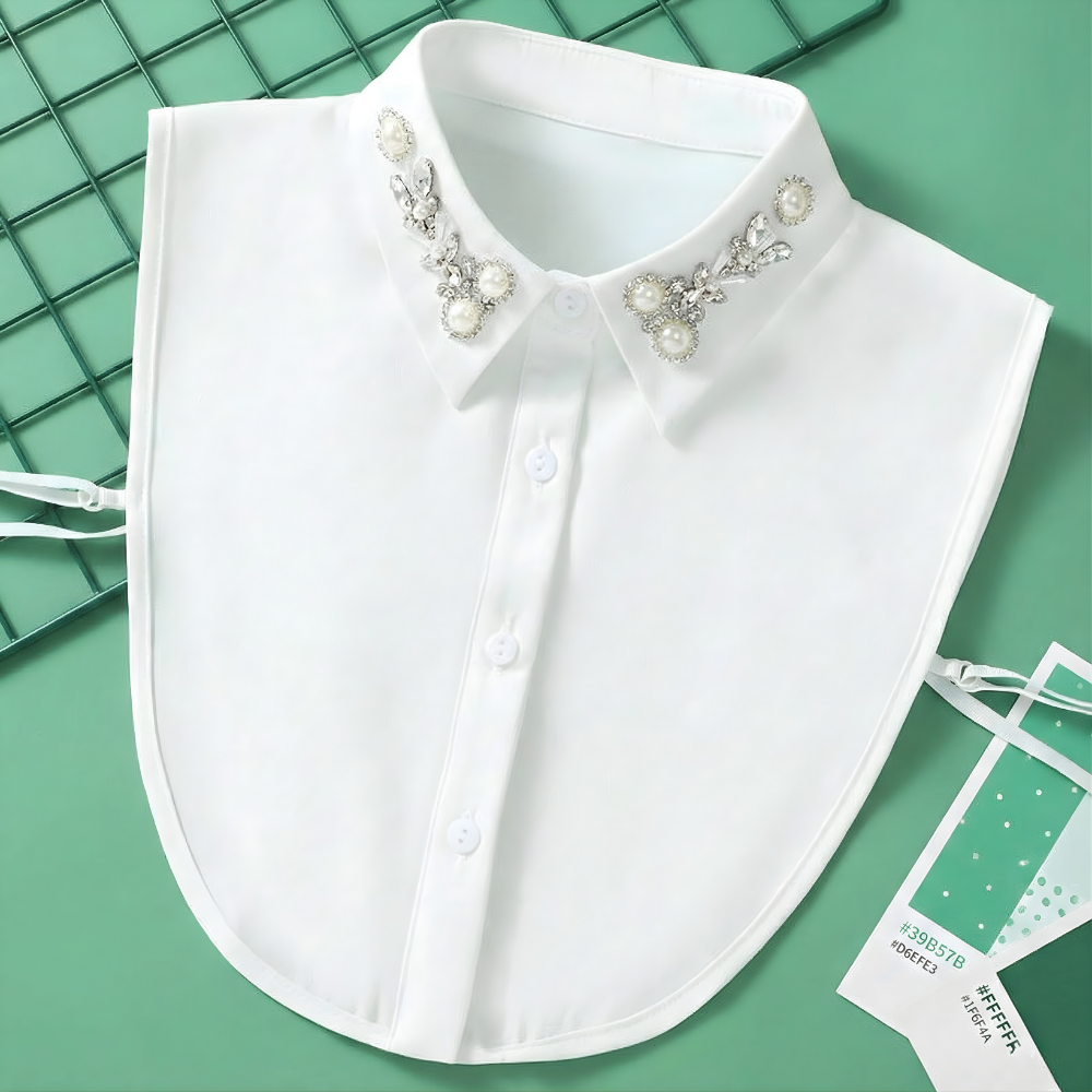 Produkt: Aftagelig falsk skjortekrave med perle- og rhinsten-detaljer