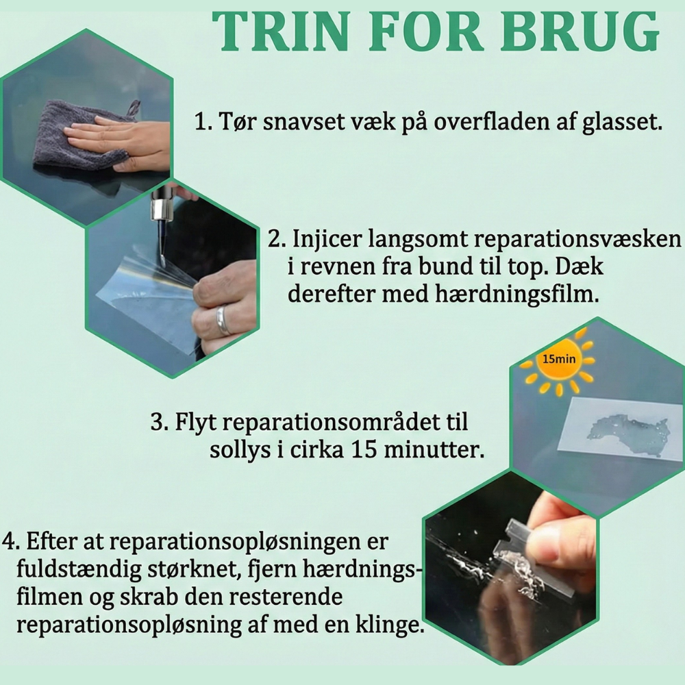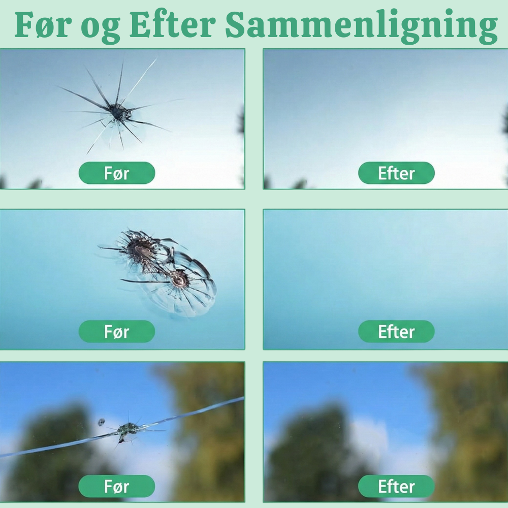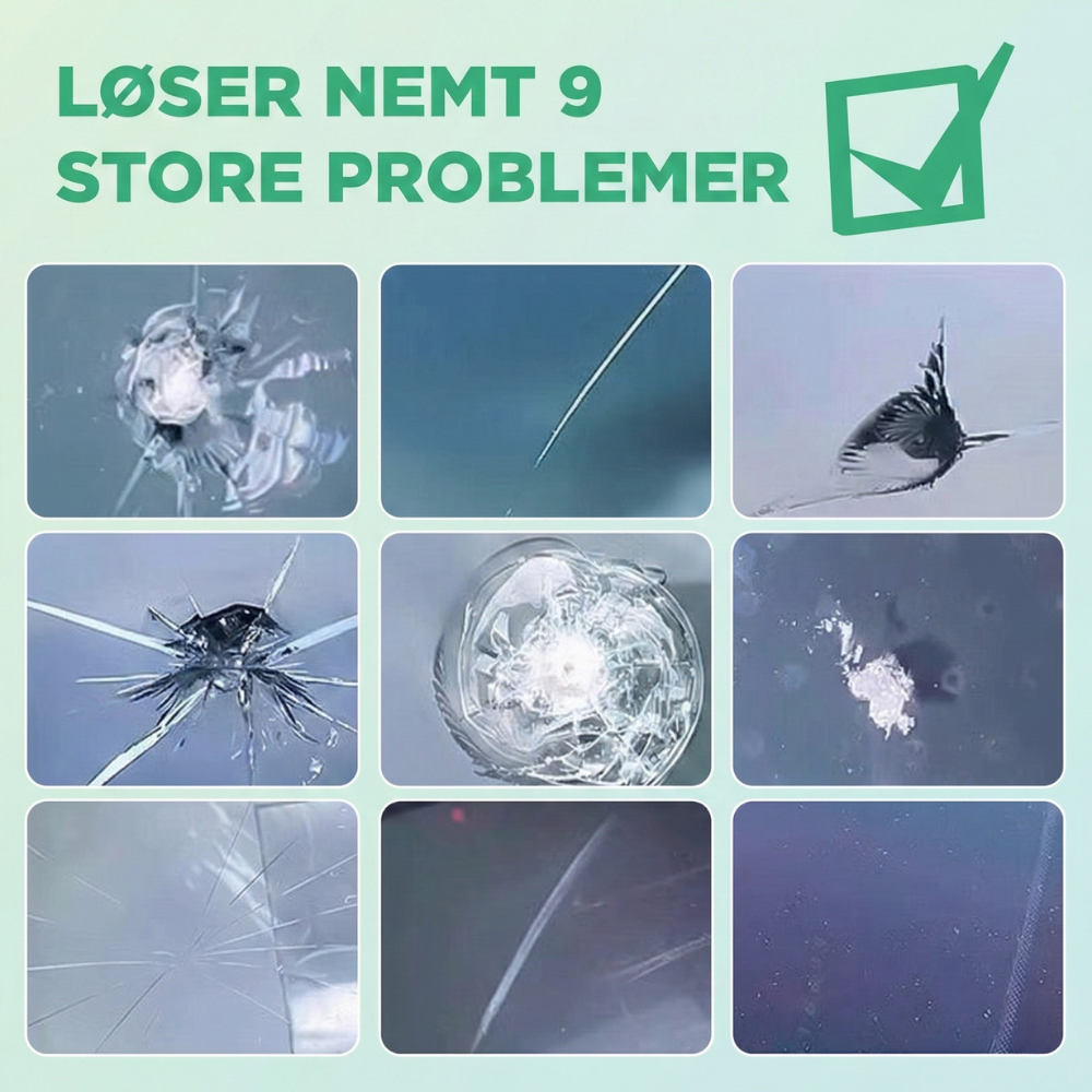 Dækker almindelige skadetyper – Virker på bull’s-eye-, stjerne- og halvmåne-stenslag samt små revner forårsaget af vejpåvirkning. De bedste resultater opnås, når skaden repareres tidligt—før den udvider sig.
