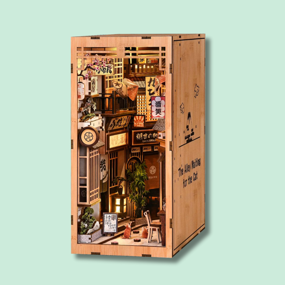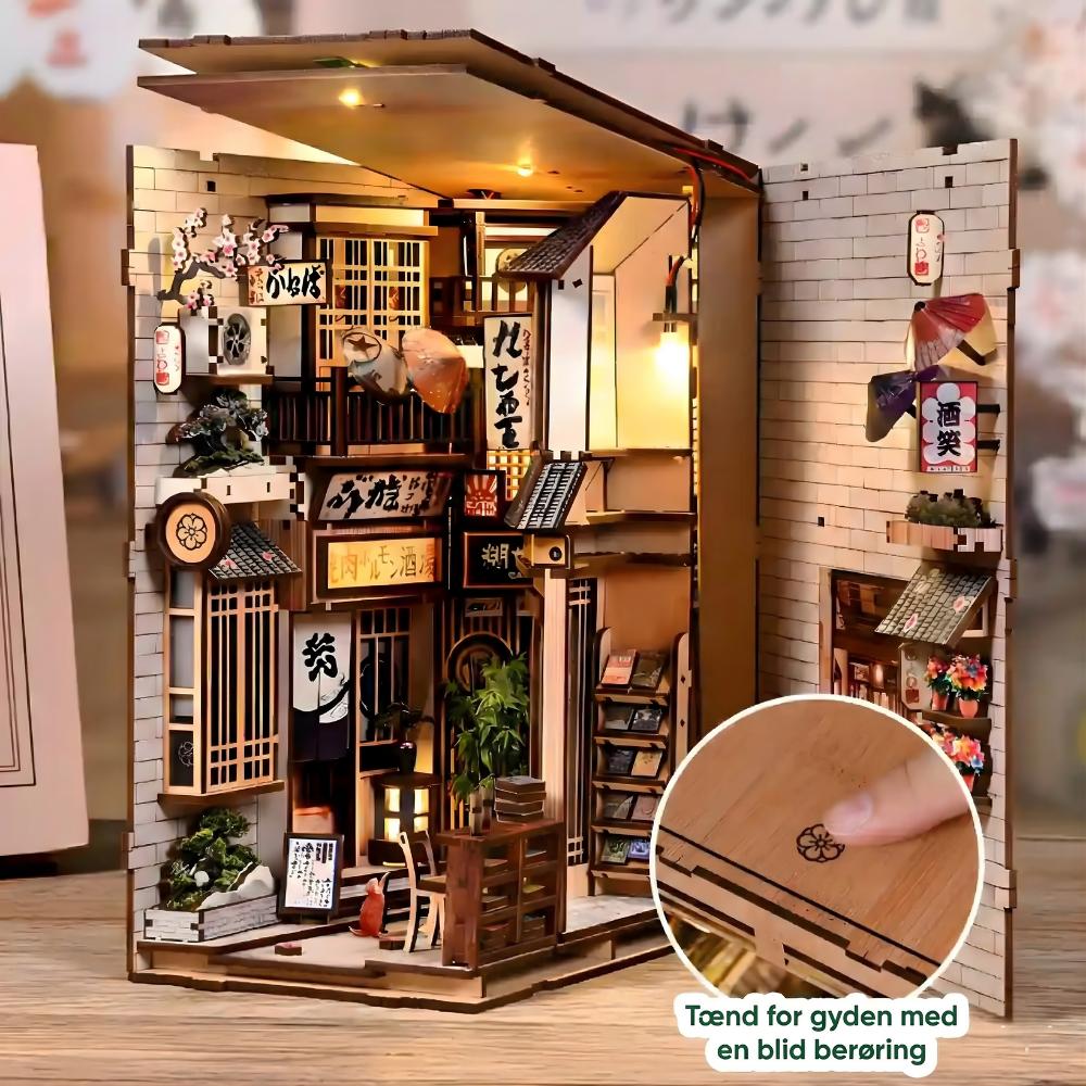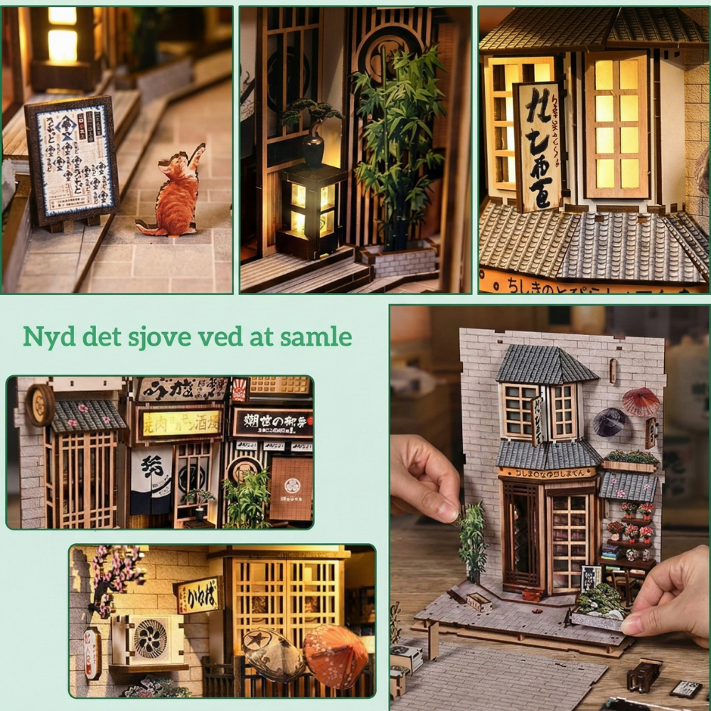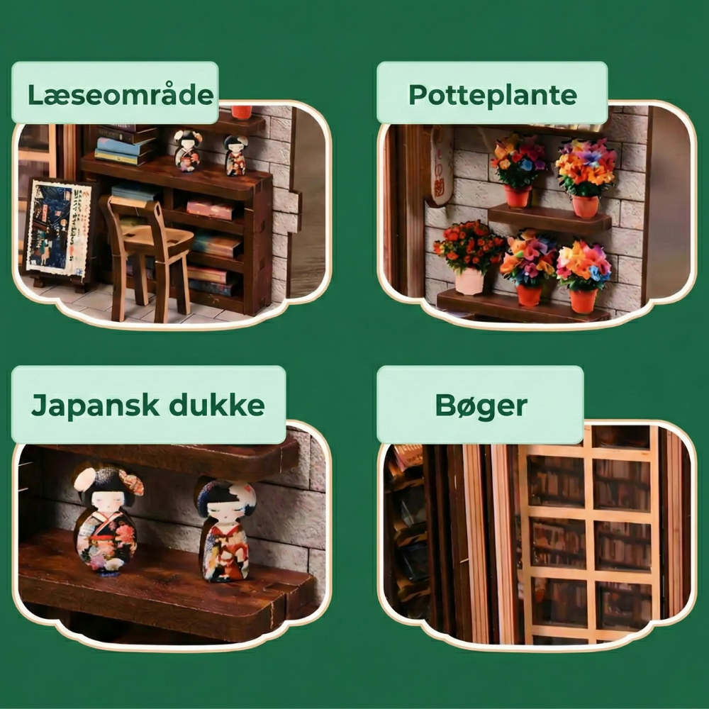 Tidløs dekoration – Når det er færdigt, fungerer dette miniaturehus og book nook som en fantastisk tilføjelse til dit hjem. Det er ikke bare et håndværksprojekt; det er et unikt, charmerende dekorativt element, der transporterer dig til Kyotos rolige skønhed.